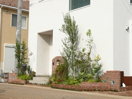 アンティークレンガを使用し、ウッドエクステリアと植栽で調和しました。メイン植栽はオリーブです!!